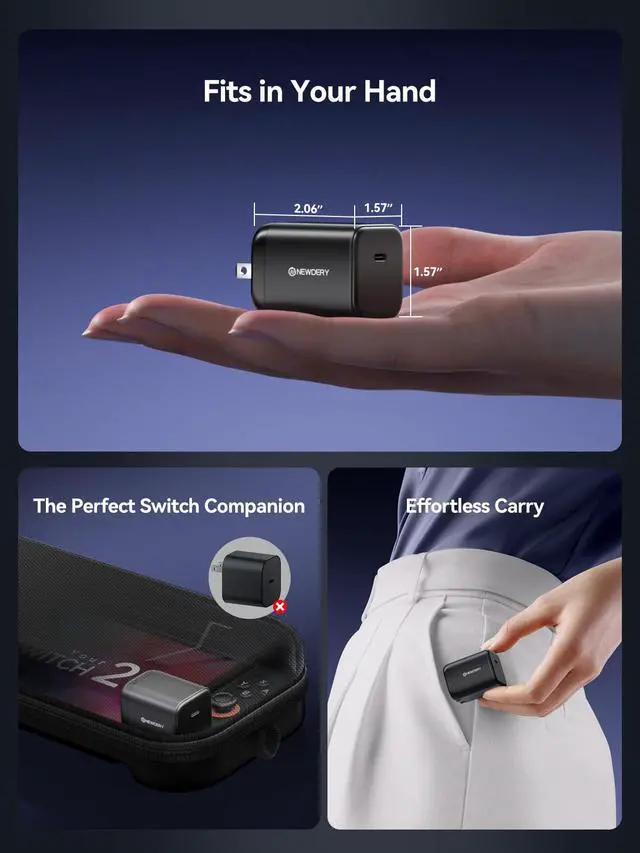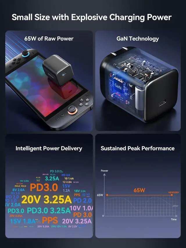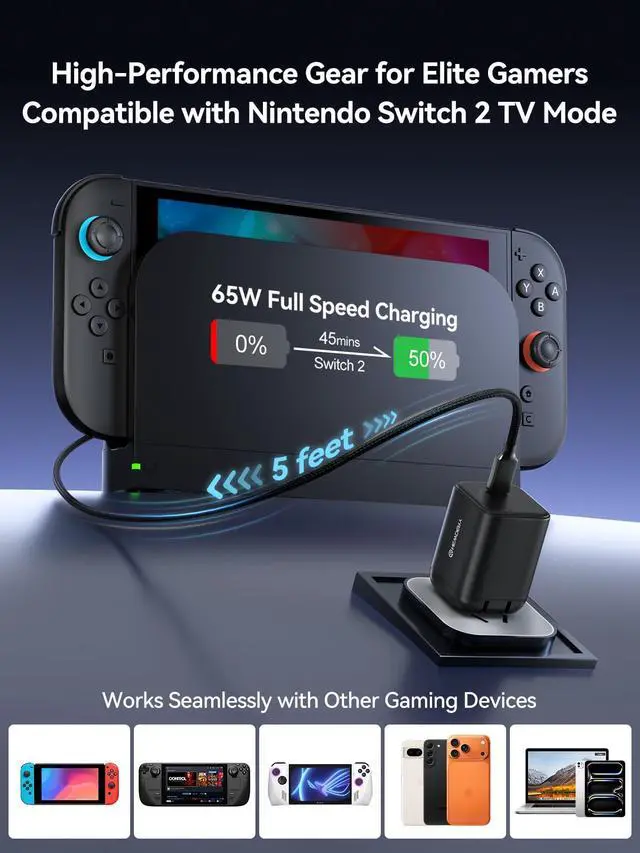 [65W Pocket-Sized Power for Gamers] The ultimate portable power adapter for your gaming setup. Engineered with advanced GaN technology, this compact block delivers a full 65W of power for your Nintendo Switch 2 & Steam Deck, yet is 60% smaller than the bulky original chargers.