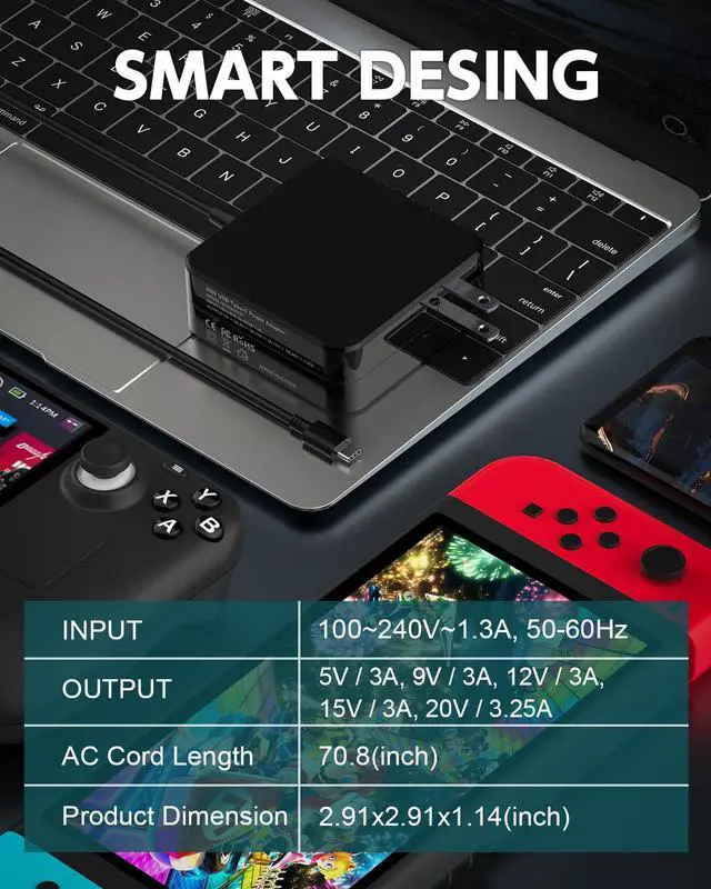 - Output: 5V/3A, 9V/3A, 12V/3A, 15V/3A, 20V/3.25A