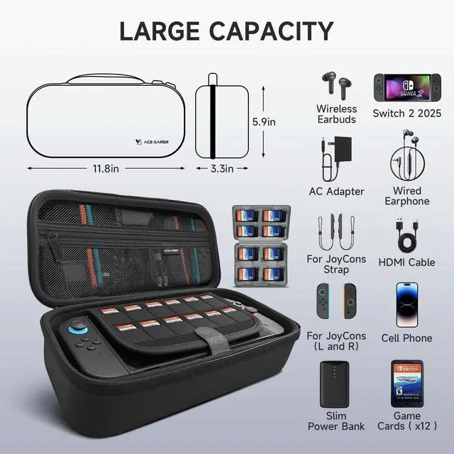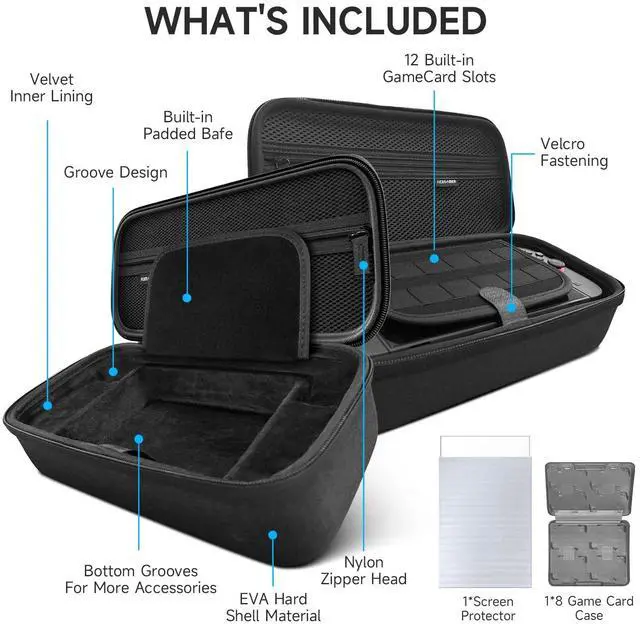Massive Storage | Smart Organization Main compartment plus a hook&loop to lock your console securely in place. Mesh pockets organize for the plug, charging cable, ear buds, and 2 extra Joy-Pads. Store 12 game cards in the main case and 8 in the portable case for 20 total. The expanded bottom compartment even fits our shop mini pocket controller and a slim power bank,make you enjoy all the games.