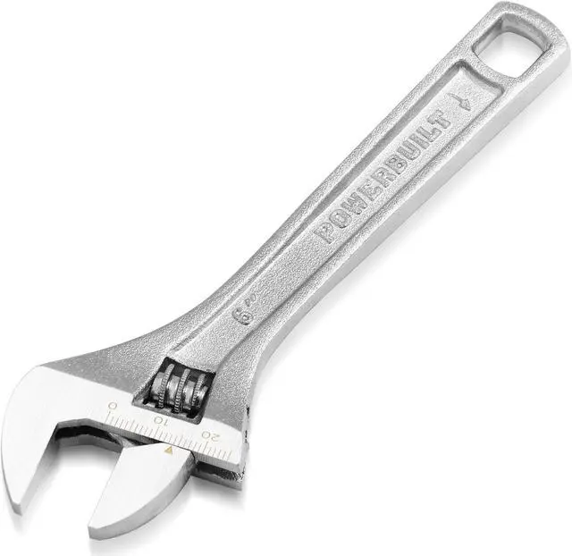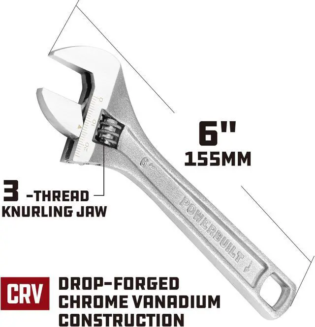 Powerbuilt adjustable wrenches are constructed from drop-forged chrome vanadium steel and fully polished to help prevent against corrosion. An extra-thick I-beam design offers greater comfort at high torque levels and the precision worm gear keeps jaws from loosening. In addition, the jaw is marked with an inch scale for easy bolt size identification.
