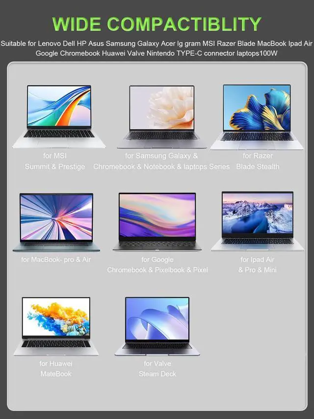 100W ChargerUSB-C Laptop Charger for Lenovo-Acer-Dell-Asus-Mac Book-Pro/Air-MSI-Razer