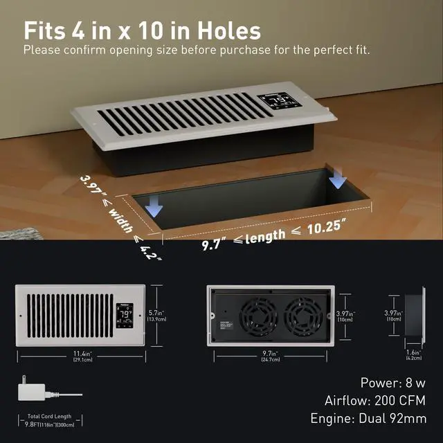 NOTE: Remove the existing cover before measuring and surveying the internal length and width dimensions of the vent. Compatible holes range in width of 3.97~4.2 inches and length of 9.7~10.25 inches.