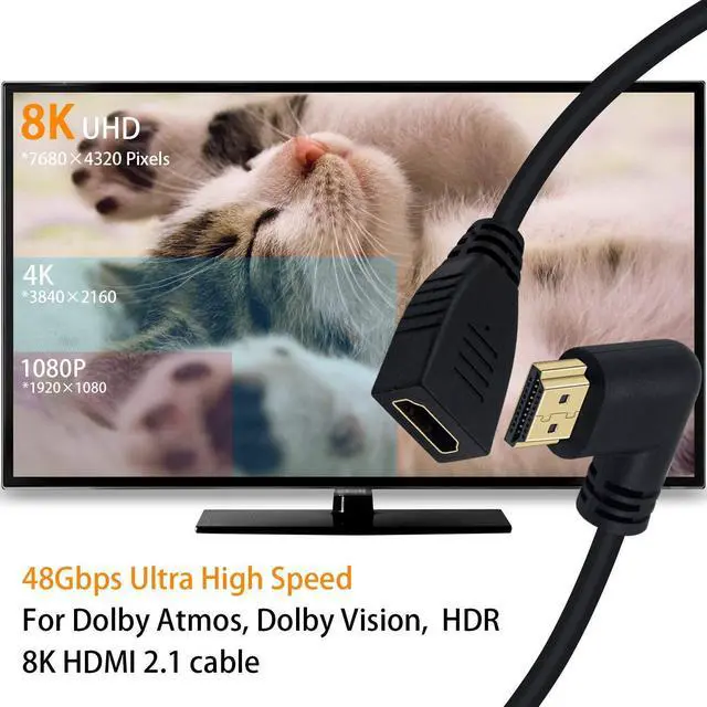 • 90 Degree 8K HDMI Cable design makes the cable better fits for wall-mounted devices, solving the embarrassment of limited spaces between wall and device,Plug and Play.