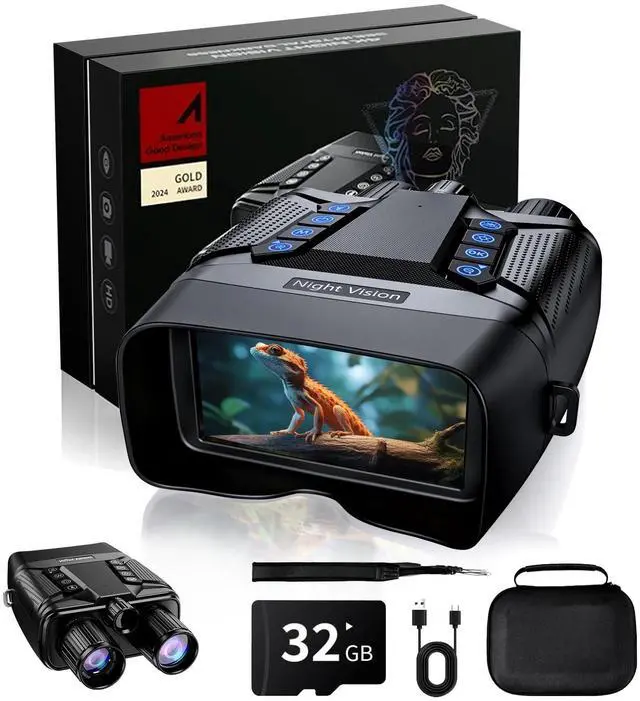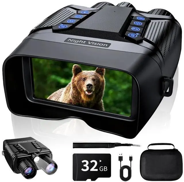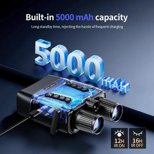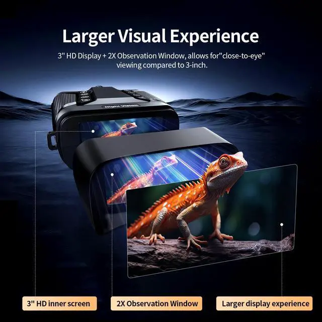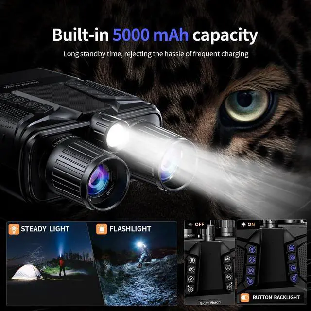 Extended Battery Life and Display: Powered by a 5000mAh rechargeable battery, the binoculars night vision can record for up to 16 hours; The 3-inch internal HD display, enhanced by a 2x window, provides a 5-inch viewing effect with 8 levels of brightness