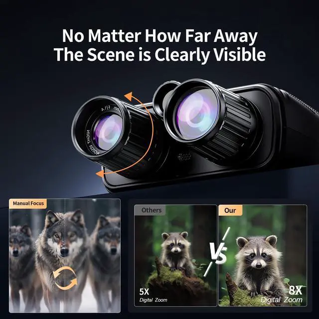 High Zoom and Visibility Range: These night vision binoculars offer 8x digital zoom; With a visibility range of 2000 feet, the night vision binoculars for adults are suitable for various outdoor activities, including wildlife observation and exploration