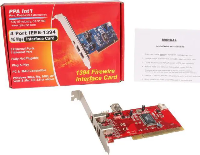 | Features | Memory-mapped architecture Backwards compatible speeds Hot swap ready Three external and one internal six pin connector 32-bit CRC error correction PTC resettable fuses for reliable over-current protection C1394 compliant IEEE 1394-1995, P1394A and OHCI (rev. 1.0) Asynchronous and Isynchronous data transfer at 100/200/400Mbp/s 4.5-meter maximum cable length Three size-programmable FIFO buffers |