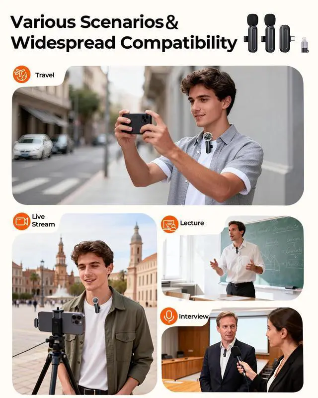 Multi-Device Support: This mini microphone offers versatile multi-device support, including smartphones like wireless microphone for iPhone, Android and computers. It functions as a reliable phone microphone and connects easily via included adapters, making it perfect for hybrid work, podcasting, and video production.