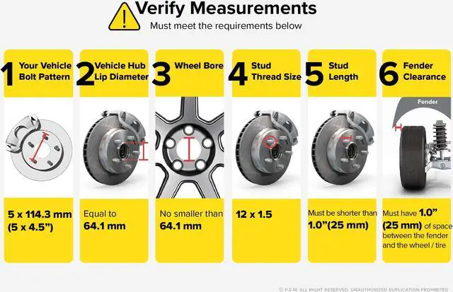 - [VERIFY FITMENT] Even if a vehicle is listed as being compatible, buyers still need to check: 1) Wheel studs are M12x1.5 12x1.5mm threads; 2) You have 1.0" (25mm) of space between your fender and your wheel/tire; 3) Your factory wheel studs are shorter than 1.0" (25mm) (NOTE: If your wheel studs are too long, you may need to grind/trim the stud down to fit); 4) Wheel center bore needs to be no smaller than 64.1mm.