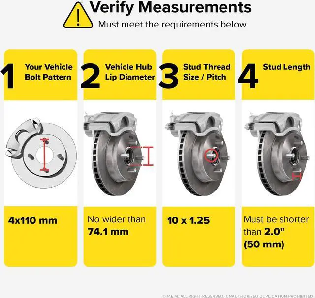 - [SPECIFICATIONS] Package: Set of Two (2) wheel spacers | Thickness: 2.0" (50mm) Wide | Bolt Pattern: 4x110 | Hub Center Bore: 74.1mm | Stud/Nut Thread Pitch: 10x1.25 | [MATERIAL & MANUFACTURING] Spacers are CNC Machined to exact specifications from high quality Aerospace Billet Aluminum. Undergoes anodizing process to prevent surface corrosion and rust. Includes heat treated 10.9 grade carbon steel studs.