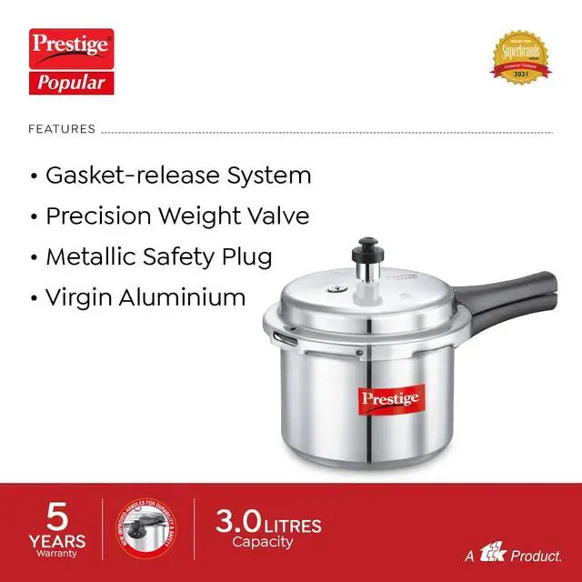 Prestige Popular is an outer lid pressure cooker made from virgin aluminium which is light in weight and long lasting. The outer lid feature is suitable for both separator cooking and direct vessel cooking.