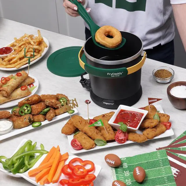 | Features | Saves money on oil! Uses just four cups of oil to make four big servings. Stores oil to use again and again. No controls to set! Maintains the perfect frying temperature automatically. Crispy, crunchy deep fried food! Delicious french fries, shrimp, chicken, onion rings and more. Handy scoop lifts, drains, and serves. No messy basket. Easy to clean! PFAS-free ceramic nonstick surface inside and out. Easy to store! Snap-on lid lets you store oil right in the fryer to use again and again. One year limited warranty. 120 volts AC, 1200 watts, Oil Capacity: 4 cups |