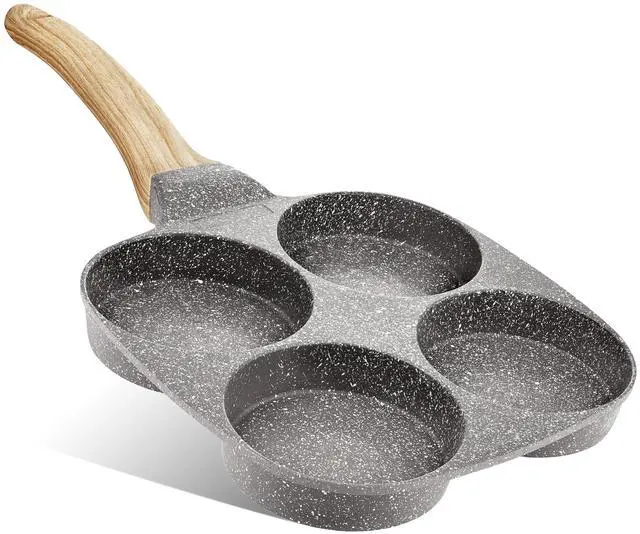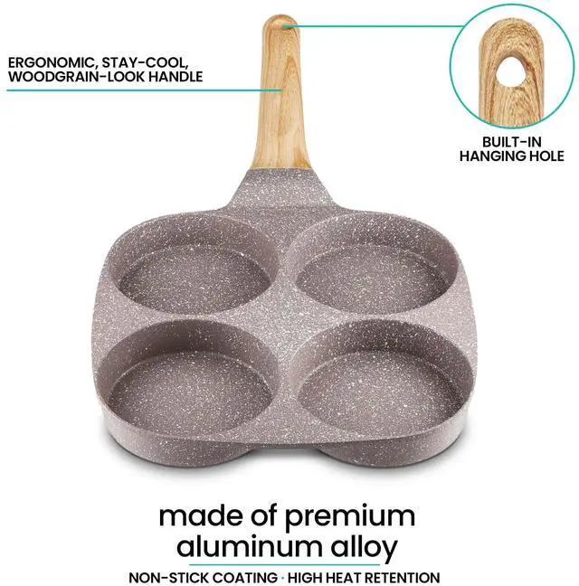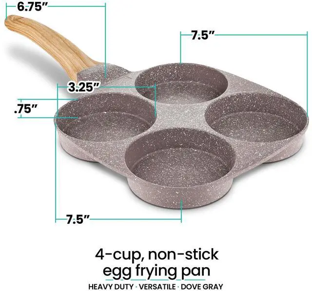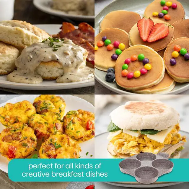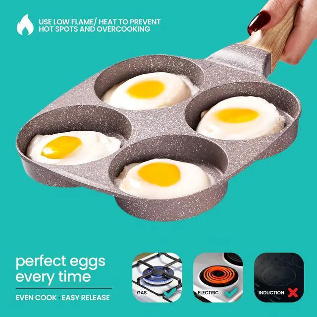 Make breakfast easy with the Modern Innovations Egg Frying Pan. Designed with 4 egg molds, our pan cooks 4x as much as the average egg skillet. The aluminum construction produces higher heat retention to cook eggs in only 3 minutes. This saves you time and cooking space. From colorful veggie egg bites to savory egg sandwiches, our frying pan can be used to cook all kinds of creative breakfast dishes. Compatible with electric and gas stove tops. *Do not use on induction. Hand-wash only - not dishwasher safe.