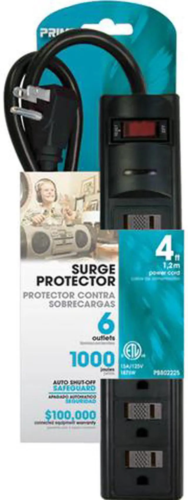 Prime Wire PB802225 15A, 120V, 1875W, 6 Outlet Power Strip, 4ft Cord