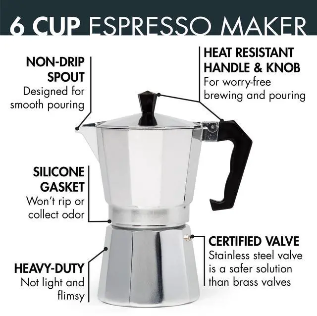 Classic Stovetop Espresso and Coffee Maker, Moka Pot for Italian and Cuban Café Brewing, Greca Coffee Maker, Cafeteras, 6 Espresso Cups, Silver