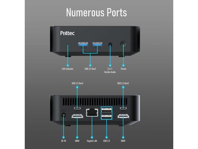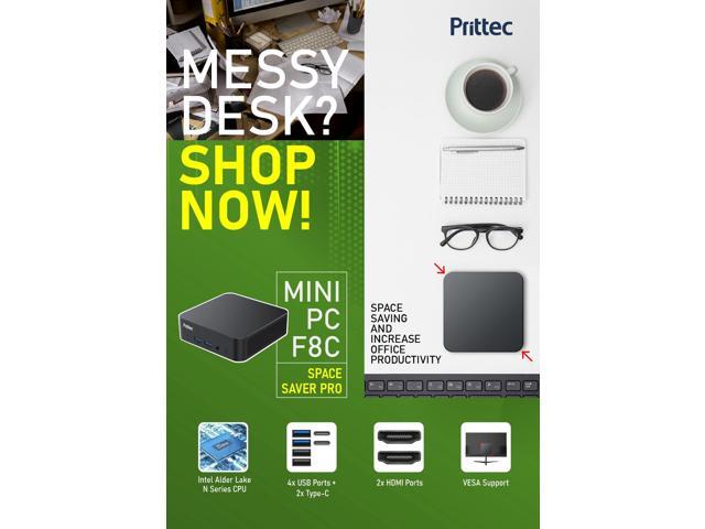 Prittec F8C Mini PC, Intel Alder Lake-N N100, 16GB DDR4, 512GB M.2 SSD, Support 4K, Triple Display, HDMI x 2, USB3.2 Gen2 x 2, USB2.0 x 2, Type-C x 2, WiFi6/BT5.2, GB LAN(RJ45), OS