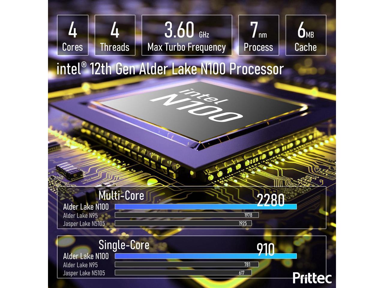 Efficient Quad-Core CPU: Intel 12th Gen Alder Lake N100 (4C/4T, up to 3.4GHz), faster than N5095/N5100/N5105