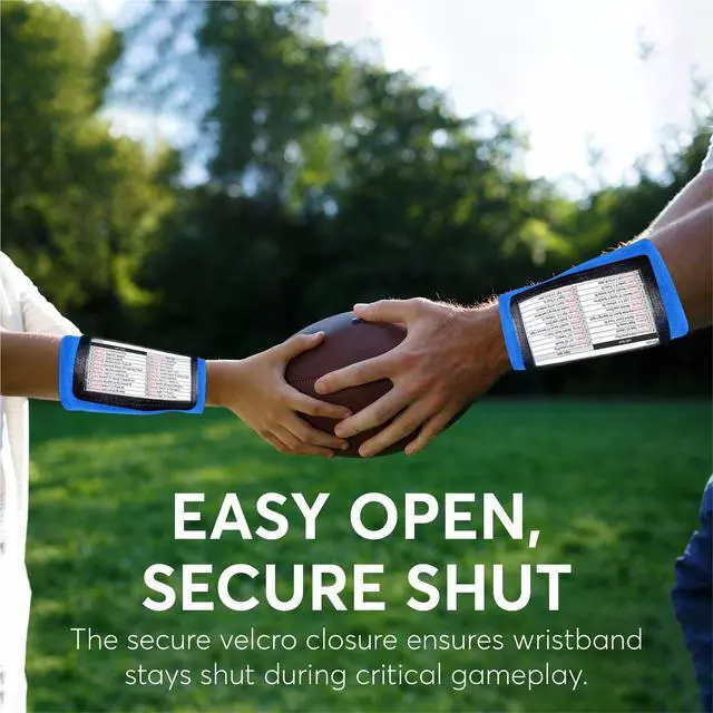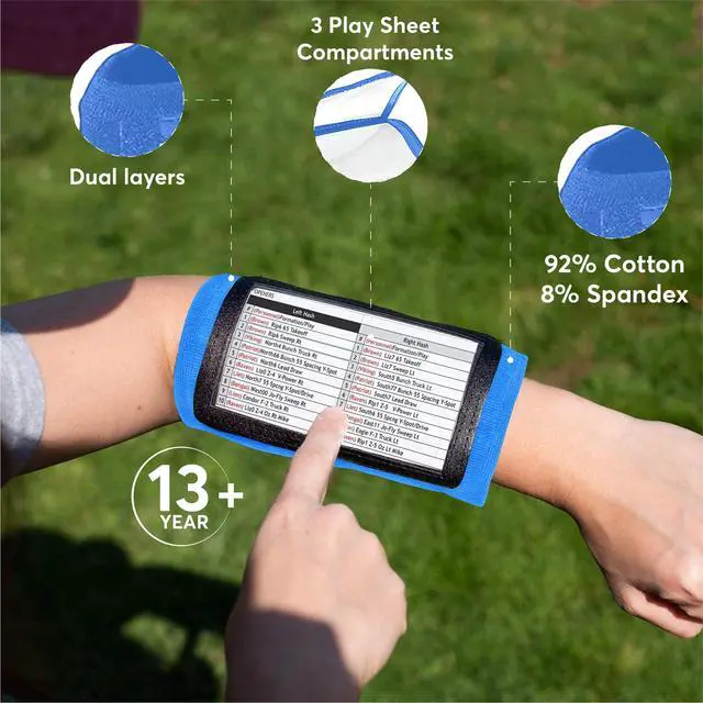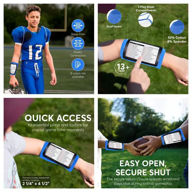 The QB Wristband provides the ability to review your plays on field and call out positions with ease when necessary. Not only is this convenient but it also increases chances of winning the game and improving both yours and your team's performance.The wristband is designed to fit youthplayers of any sport including but not limited to: basketball, lacrosse, soccer, different variation of football, rugby etc.. The playbook is made of cotton and spandex and thus is built for durability and comfort. The velcro portion ensures that it remains on your arm. With Many Size options available order your pack today for an amazing price!