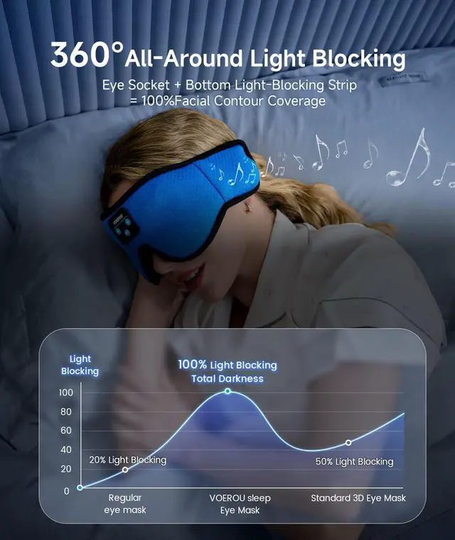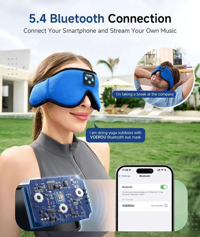 [Bluetooth 5.4 Wireless Connectivity] Voerou bluetooth sleeping mask headphones feature with latest Bluetooth 5.4 chip: fast paring speed and less power consumption. Seamlessly connect to your smartphone, tablet, or any Bluetooth-enabled device to stream your favorite music, podcasts, or white noise without tangled wires. The bluetooth sleep headphones wireless music eye mask also allows you to listen to music without wearing additional headphones, which make you fall asleep faster