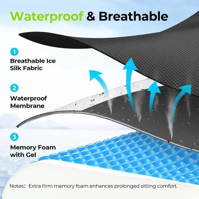 Built for long sitting without stuffiness or thigh pressure, this seat cushion features large gel coverage, breathable anti-bedsores fabric with a waterproof membrane to keep skin dry, and an ergonomic thigh slope to improve circulation.