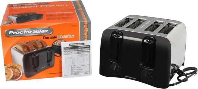 Features This Proctor-Silex Black and Chrome Toaster has cool-wall sides so hands will not be burned if accidentally touched.
