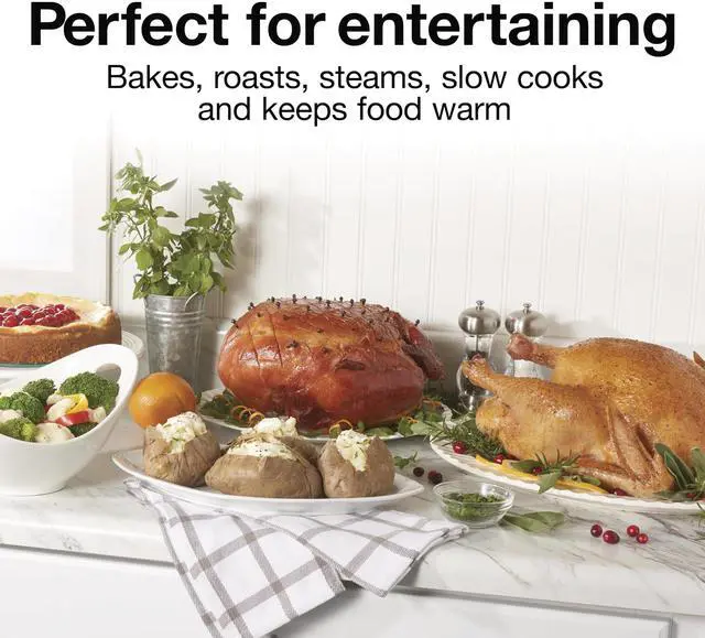 The roaster oven can do everything from steam vegetables and roast potatoes to bake a cheesecake. The domed, self-basting lid ensures meats like turkey and ham turn out tender, moist and delicious. You'll love the convenience of preparing food in one pan in this roaster that's simple and intuitive to use. The removable cooking pan removes for easy cleaning, and the lift-out rack lets you lift large meats like baked ham and roasted turkey from the roaster oven with ease.