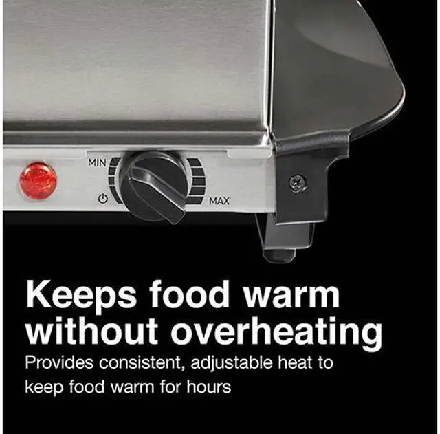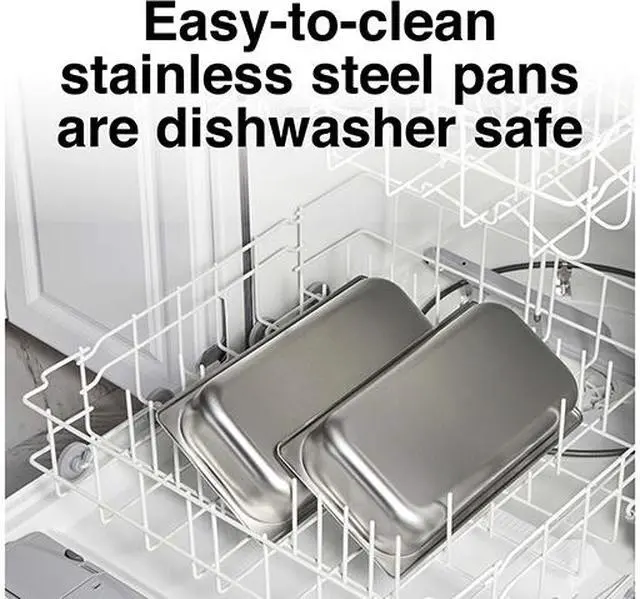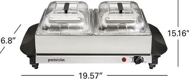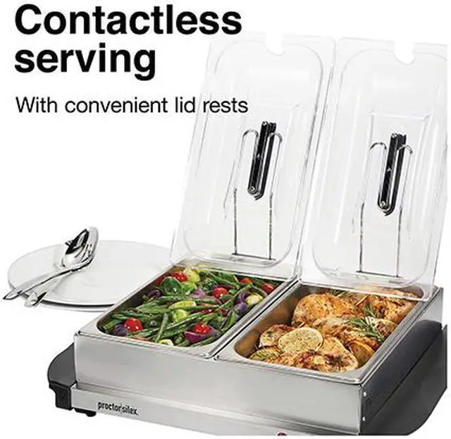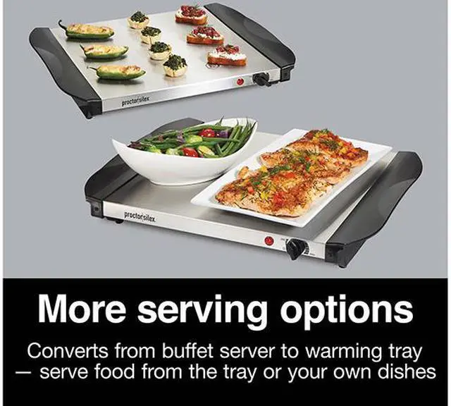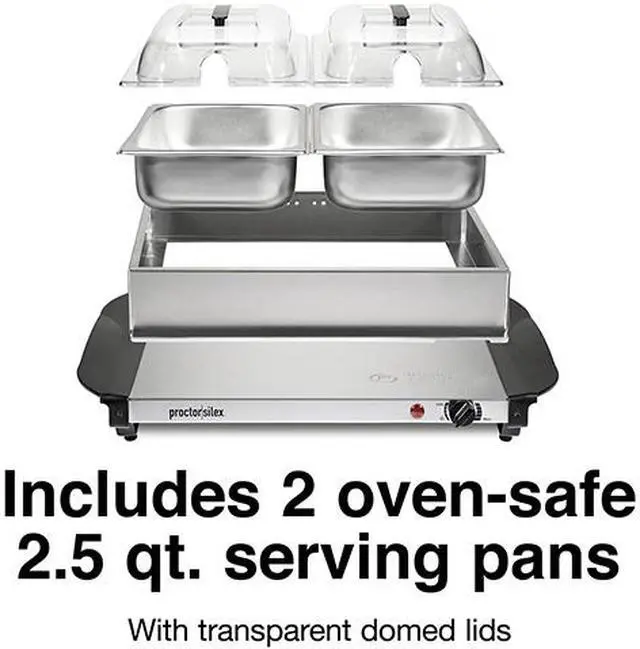 | Features | Easily converts from buffet server to warming tray for more serving options Includes 2 oven-safe 2.5 quart pans with transparent domed lids Easy-to-clean stainless steel pans are dishwasher safe Keeps food warm for hours without overheating Contactless serving with convenient lid rests Easily lift or move the tray with cool-touch handles Looks great on the countertop |