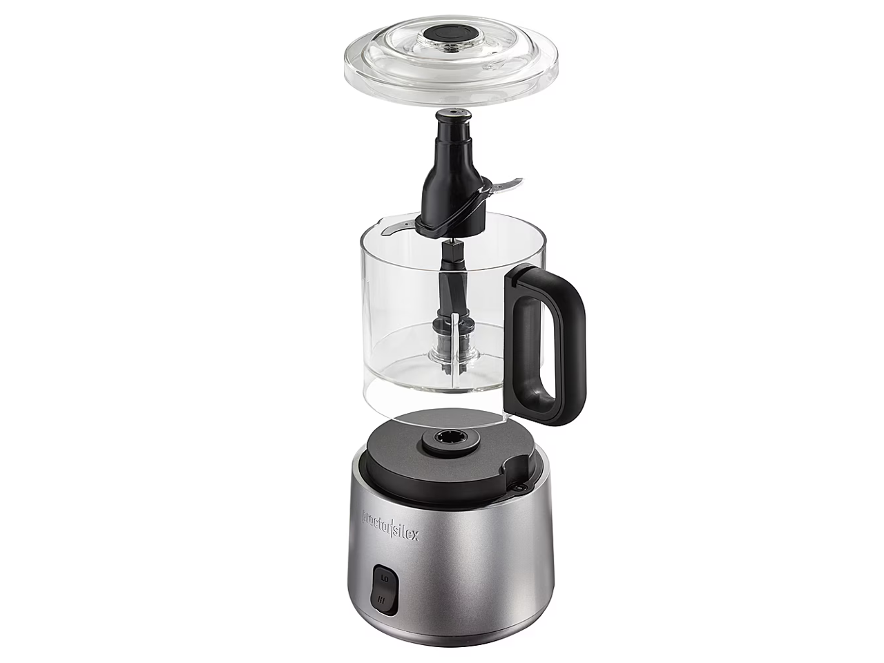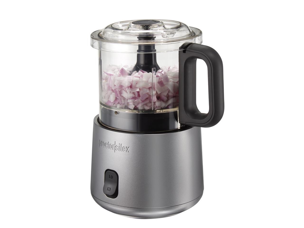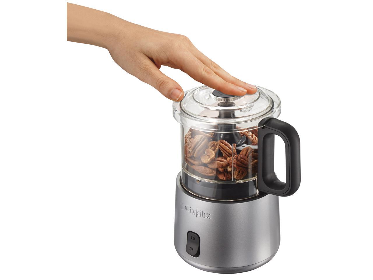 This easy-to-assemble mini food processor simply stacks into place so there's no difficult twisting or locking. To chop or process food, just press down on the lid and release to stop.