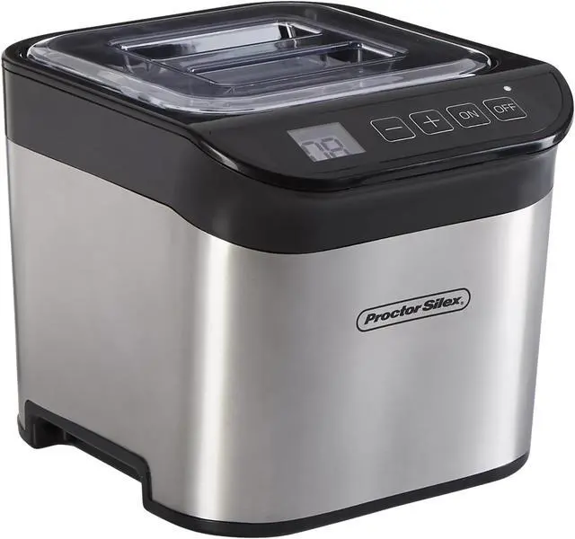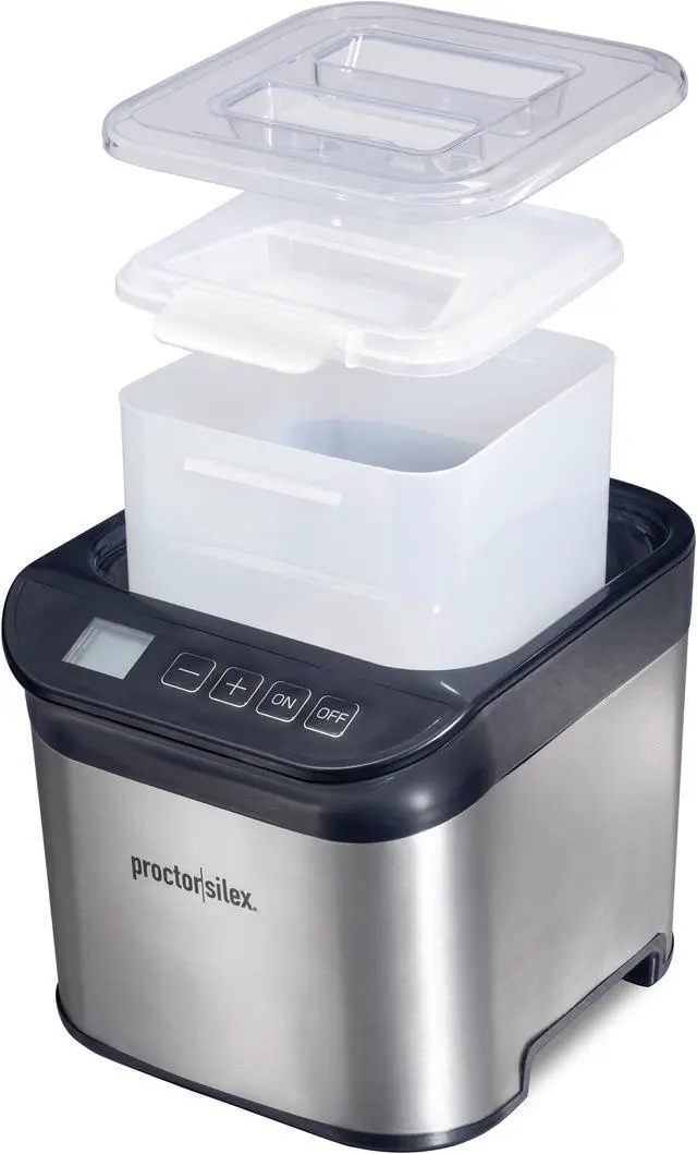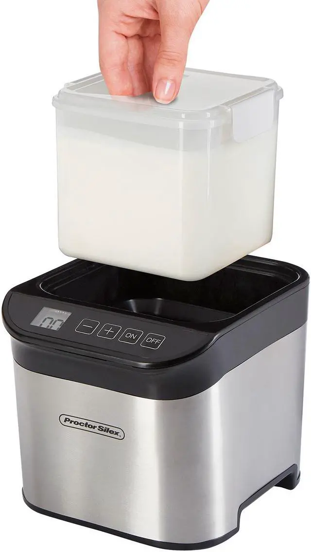 | Features | Prepare and store yogurt in the same container: After yogurt is cultured in the included 32 oz. container, it can be stored right in the refrigerator. Airtight storage: Included plastic container is BPA-free in food zones and has snap-down clips for easy storage. Digital controls: The convenient digital timer counts down the hours until your yogurt is ready. An alarm will chirp to let you know when it’s done. Easy to use and clean: Preparing and storing yogurt in one dishwasher-safe container means less cleanup at the end and more consistent results. Recipes included: Get inspired to create a variety of yogurts with different toppings and mix-ins. |