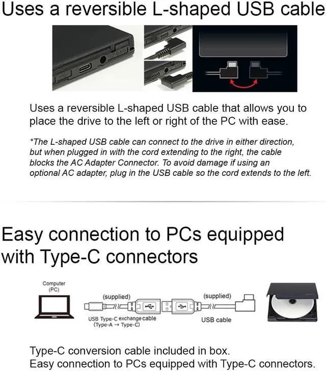 Type-C conversion cable included in box. Easy connection to PCs equipped with Type-C connectors.