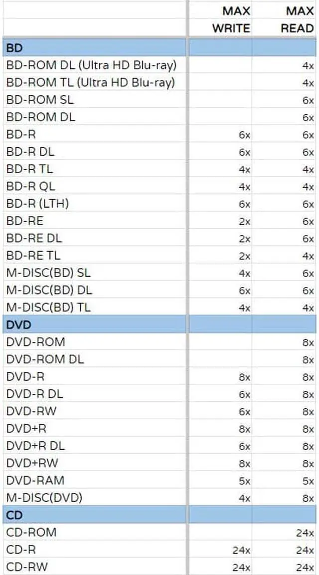 Up to 6x writing on BD-R SL discs, 6x on BD-R DL discs, and 4x writing on BD-R TL discs and BDXL support.