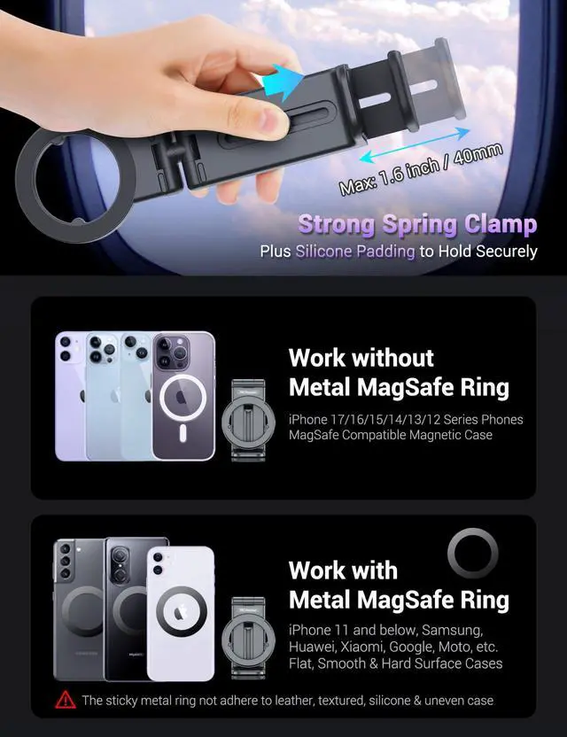 The First MagSafe Plane Mount in the World & Works with All Phones It is specially designed for iPhone 17 / 16 / 15 / 14 / 13 / 12 series phones without case or with official MagSafe case or other third party MagSafe-compatible cases which have built-in magnets, no extra metal ring required. For iPhone 17 / 16 / 15 / 14 / 13 / 12 series phone with a regular Non-MagSafe compatible case and for other smartphones, you have to stick the 3M adhesive hollow metal ring included onto the back of your phone case