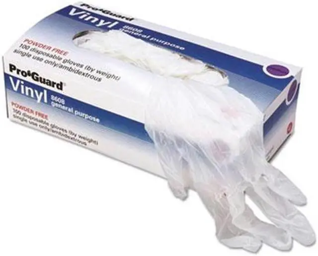 Keep your hands secure with these powdered, general-purpose gloves. Beaded cuff prevents rolldown for comfortable use during extended periods. Disposable design allows quick cleanup after each use. Ambidextrous construction fits comfortably on either left or right hand. FDA-compliant, size-medium gloves are perfect for food preparation, light-duty cleaning, painting, manufacturing assembly and more.IMP8608M. 8608M. Proguard ProGuard Disposable Vinyl Powder Free General Purpose Gloves. Disposable & Single Use Gloves