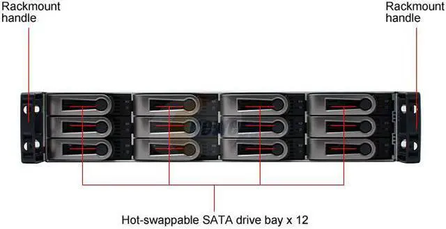 | Features | 12 hot-swappable SATA drive bays in a robust 2U chassis Supports 3Gb/s and 1.5Gb/s Serial ATA drives – NCQ and TCQ Dual Ultra 320 SCSI channels with four VHDCI ports Up to 465MB/sec sustained throughput (cache hit using both ports) Redundant, hot-swappable power and cooling Comprehensive embedded web-based management via Ethernet Command Line Interface/Utility via RS232 Serial Port LUN Mapping and Masking Multiple global or dedicated hot-spare drives PerfectRAID and Predictive Data Migration technolog y for robust error handling and recovery |