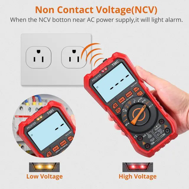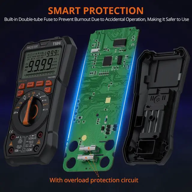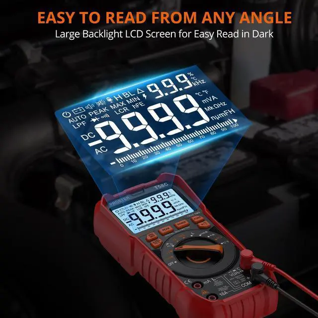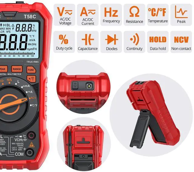 Overview: This digital multifunctional multimeter with high precision and high performance can measure AC/DC voltage, current, resistance, capacitance, inductance, frequency, duty ratio, temperature. It also can test NCV(non-contact voltage), diode, transistor and continuity. With a bracket on the back, convenient to place it on the table and read the values. It is widely reserved in schools, laboratories, factories and any other machining industry.Not only suitable for home users, beginners, maintenance enthusiasts, but also for professional electricians and technicians. Specifications: Main material: ABS DC Voltage Range and Accuracy: 1V/10V//100V/1000V ±(0.5%+5); AC Voltage Range and Accuracy: 1V/10V/100V/750V ±(1.0%+4); DC Current Range and Accuracy: 1mA/1A/10A ±(1.2%+5) AC Current Range and Accuracy: 1mA/1A/10A ±(1.5%+5) Resistance Range and Accuracy: 1K/10K/100K/1M/10M/100M ±(0.8%+5) Frequency Range and Accuracy: 10Hz/100Hz/1kHz/10kHz/100kHz/1MHz/10MHz ±(1.5%+5) Capacitance Range and Accuracy: 1nF/10nF/100nF/1uF/10uF/100uF/1mF/10mF/100mF ±(4.0%+5) Inductance Range and Accuracy10mH/100mH/1H/10H/100H ±(4.0%+5) Temperature Range: -55~1000/-67~1832 ±(1.0%+3) Duty cycle: 1%~99% Display: 9999 counts Auto/Manual Range: True RMS: NCV: Data hold: Back light: FlashLight: Diode test: 3.2V Continuity: Over load protection: Low Battery Indication: Auto Power Off: Short-circuit protection: Battery: 3 * AAA batteries (included) Item size: 18.7 x 9.5 x 5.5cm / 7.36 x 3.74 x 2.17in Item weight: 331g / 11.67oz Package size: 225 x 130 x 70mm / 8.86 x 5.12 x 2.76in Package weight: 611g / 1.34lb(battery includes) Package List: 1 * 9999 Counts Multimeter 1 * Pair of Test Probe 1 * Temperature Probe 1 * User Manual 1 * Cloth bag 1 * Alligator Clip 1 * Screwdriver 3 * 1.5V AAA battery(include) 2 * Fuses
