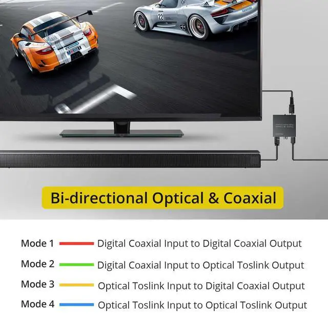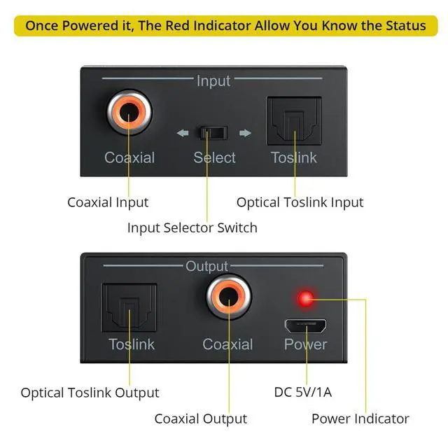 Bi-Directional Coaxial and Optical Converter: Plug and play, Coaxial to Coaxial&Toslink, or Toslink to Coaxial&Toslink, just a switch button for your input selection