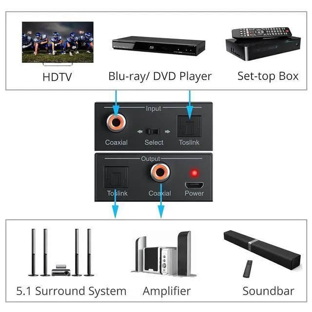Wide Applicability: 1m Coaxial cable&2m Optical cable provided for Long-distance transmission is perfectly compatible with Apple TV PS4, Xbox 360, Satellite receiver, BR player, Blu-ray Player, UHD TV, DVD, Sound Bar, Amplifier and other devices with Optical and coaxial interfaces