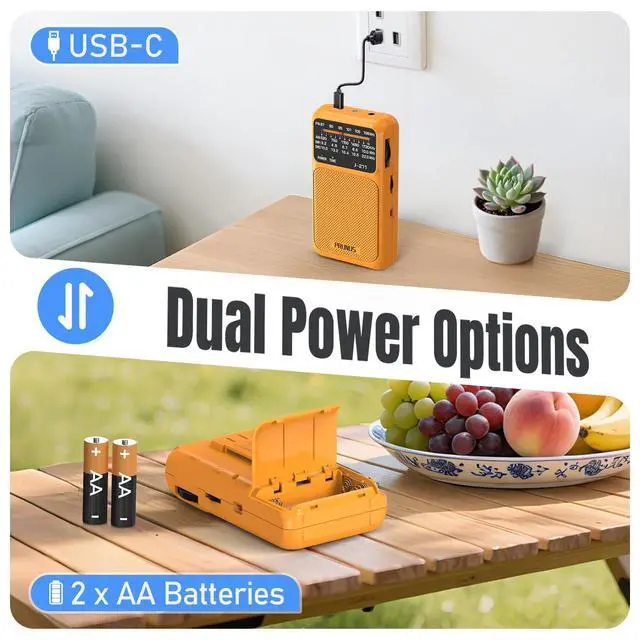 USB-C Charging and AA Battery OperatedThis am fm radio portable gives you two simple power options: 1) use the built-in 1200mAh rechargeable battery for everyday listening; 2) or switch to 2 AA batteries (not included) when youre outside or during a power outage. Just flip the small switch on the side to change power sources. Whether at home or on the go, youll always have a way to keep listening.