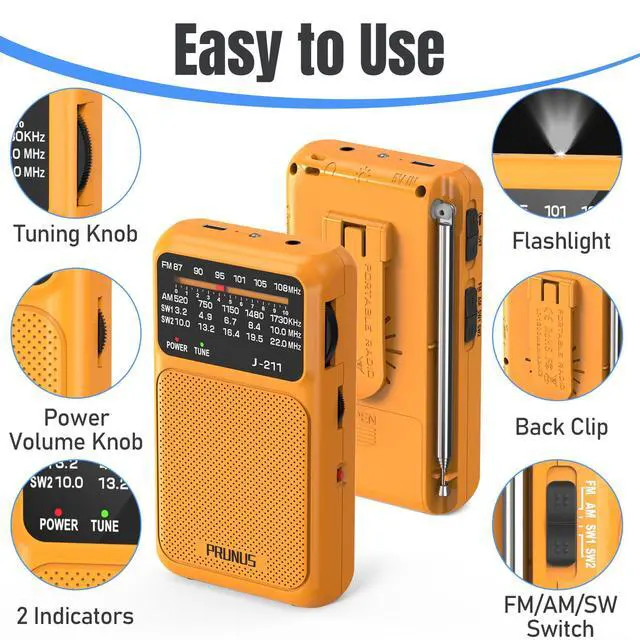 Easy to UseBig knobs for power, volume, and tuning, this transistor radio battery operated is super simple to control. Turn it on, find your station, and enjoy. Pocket radio am fm also has a built-in flashlighthandy during blackouts or at night, adding extra safety for you.