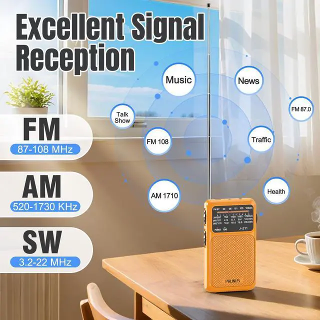 Excellent Signal ReceptionCovers FM (87108 MHz), AM (5201730 kHz), and Shortwave (SW 3.222 MHz). With a 16-inch antenna and smart DSP chip inside, this battery powered radio picks up better signals with less noise. The shortwave band is thoughtfully split into 2 parts, so its easier to find stations from around the worldeven in remote areas.