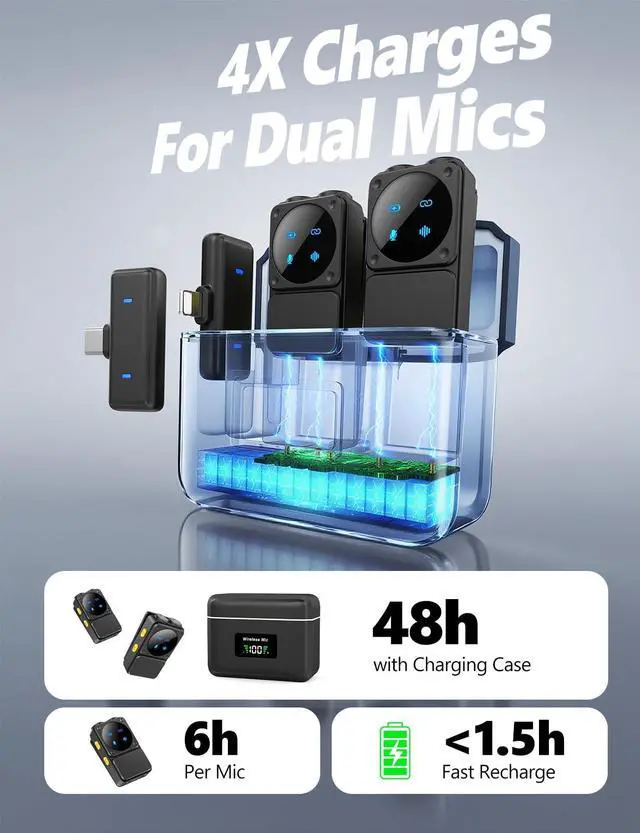 | Special Feature | 2.4GHz Wireless Plug & Play , 164FT, Battery Indicator Light, Real-Time LED Indicators, Clip-on\Dual Receiver, Charging Case, Noise Reduction, Mute, Reverb Mode, Voice Activated Recording, 1-Touch Recording |
