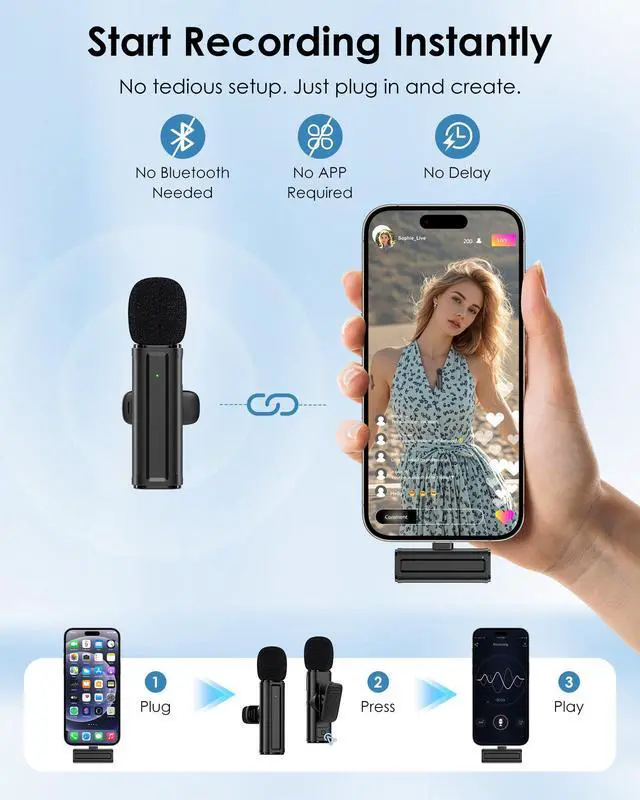 The mic offers up to 65 feet (20m) of stable wireless transmission with zero lag. Enjoy the ultimate freedom to walk around and record from far away without tangled cords.