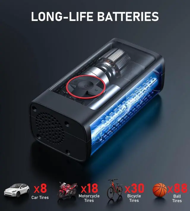 | Included Components | Tire Inflator, Ball Needle, Nozzle for Swimming Ring, Nozzle for Air Mattress, Presta Valve, Fuse, Type-C Charging Cable, User Manual |