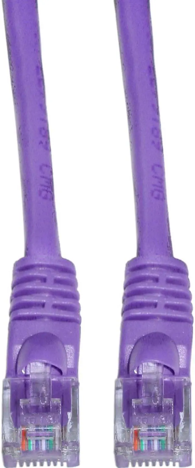 5 foot Cat5e Purple Ethernet Network Patch Cable, Snagless/Molded Boot. Cat5e Ethernet cables of the 5 foot length have a variety of uses. These cables will suffice for connecting routers/switches to Cable/DSL modems, computers to routers/switches or even in the server/network room for connecting ports on patch panels. These Ethernet Cables are great for the home office or any other environment. This particular cable is a purple UTP (Unshielded Twisted Pair) patch cable with molded boots (snagless installation) and extra protection for the RJ45 connector and clip. The individual conductors are 24 AWG (American wire gauge) stranded pure copper. Cat5e patch cables are stranded to improve flexibility. Pure copper conductors provide the best signal possible. The RJ45 plug features gold connectors to prevent corrosion thus ensuring a longer cable life. Our Cat5e Ethernet patch cables exceed the EIA/TIA-568-C standard.