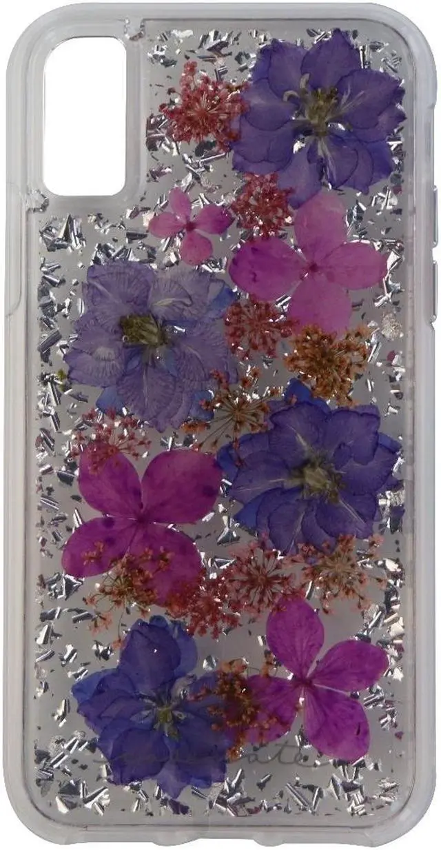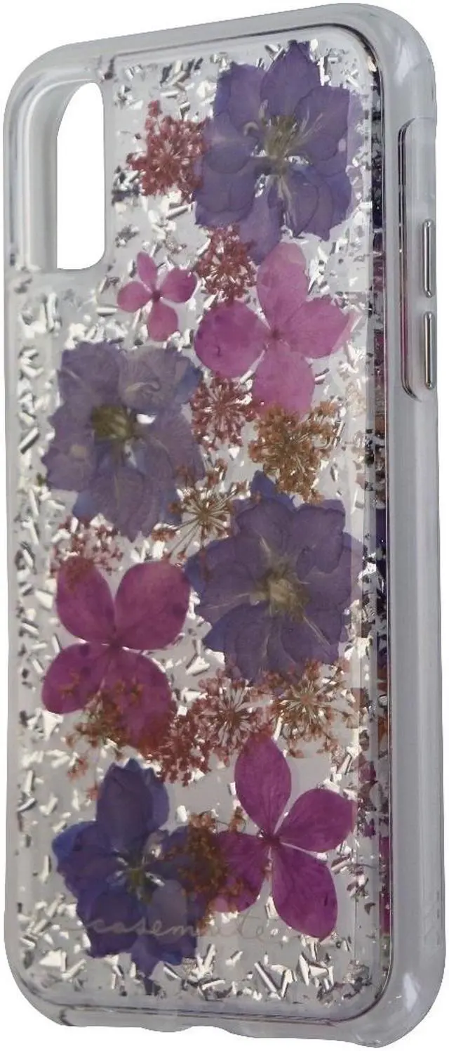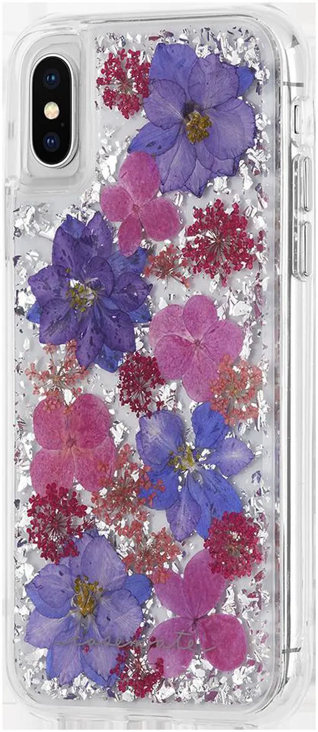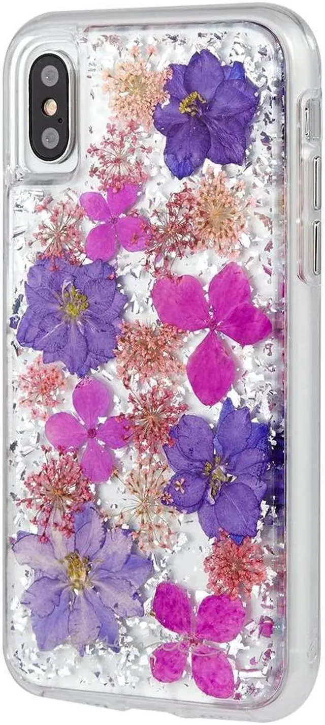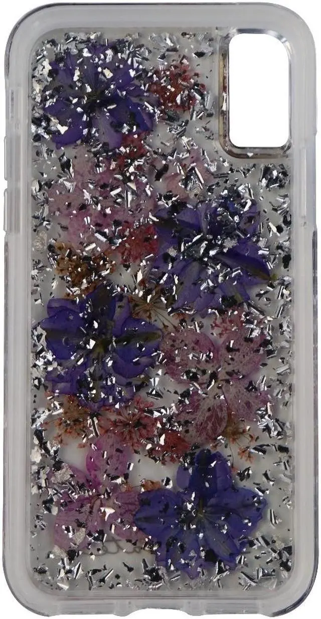 Case-Mate Karat Petals Series cased designed to be compatible with the Apple iPhone X. One piece design with a clear finish and imprinted real purple flowers. Features - Dried genuine flowers with metallic foil elements, no two cases are alike, each one is unique - Military strength impact protection (this case is certified to meet or exceed MIL-STD-810G drop test standards) - Works with wireless charging - Anti-scratch technology and refined natural feel metallic buttons