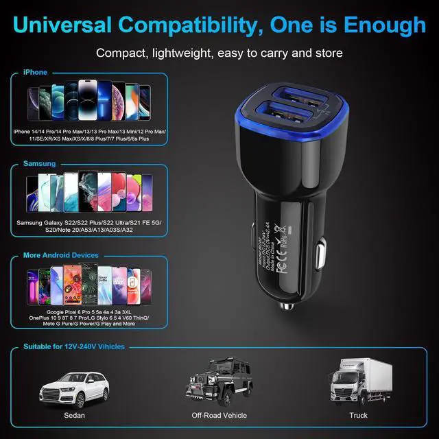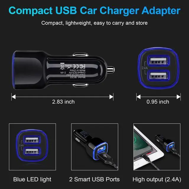 2 -Port Design: Car adapter usb charger is a practical auto accessory for charging two devices quickly simultaneously, save your time