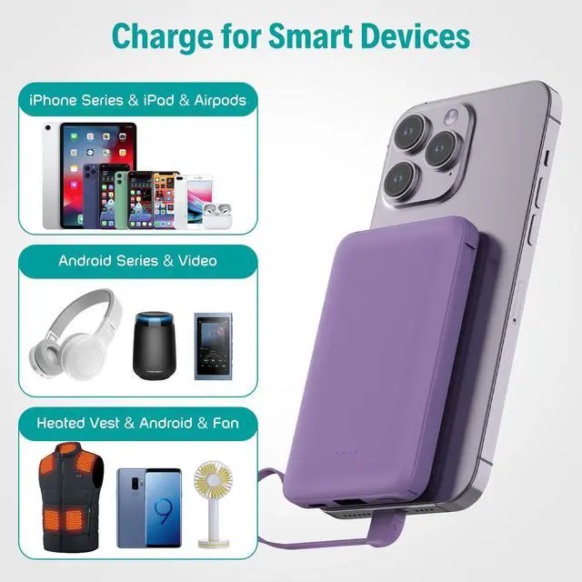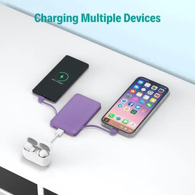 Portable charger built in cable1 for iPhone models: iPhone 14 14 Pro Max 14 Mini 13 13 Pro Max 12 12 Max 12 Pro Max 12 Mini 11 XR X 8 7, and more.