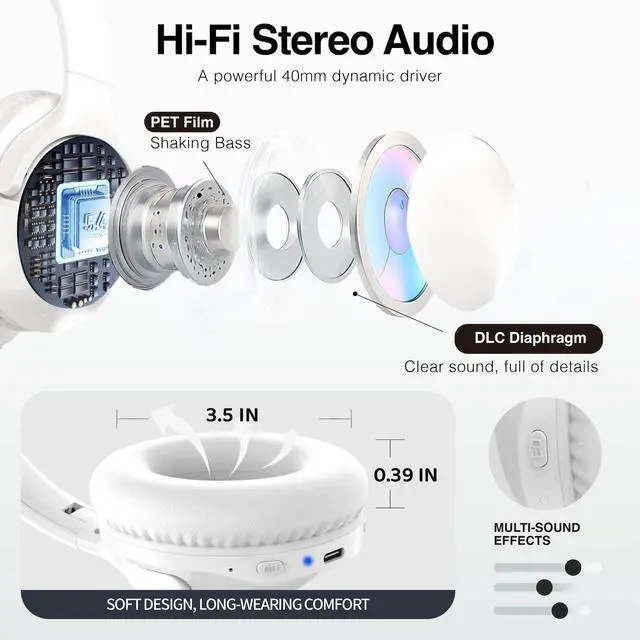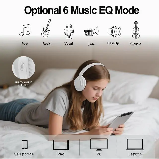 Bluetooth Headphones Over Ear 68H Playtime 6 EQ Wireless Headset with Microphone HiFi Stereo Foldable Lightweight Deep Bass for Travel Home Office Cellphone White