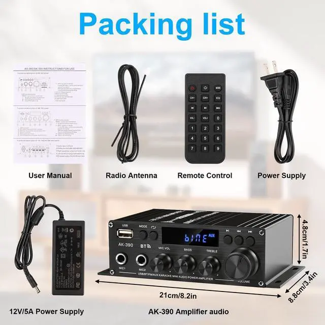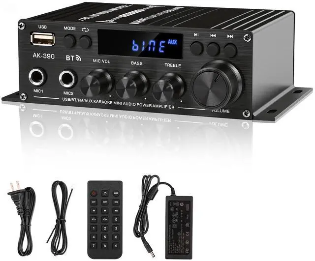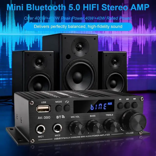 Stereo Amplifier Home Audio Receiver AK-390, AMP Speaker Bluetooth 5.0 Amplifier 400W+400W 2 Channels with 12V/5A Power Amplifier HiFi Amplifier FM Radio, (BT, USB, AUX, Mic)Input for Home Party