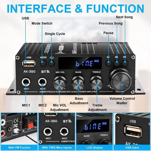 Karaoke and FM FunctionThis home audio amplifier has a microphone input, allowing you to enjoy karaoke time with friends and family. You can enjoy excellent HiFi sound quality. In addition, there is an FM radio function.