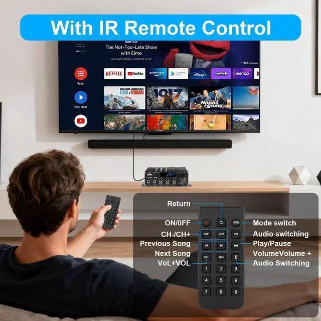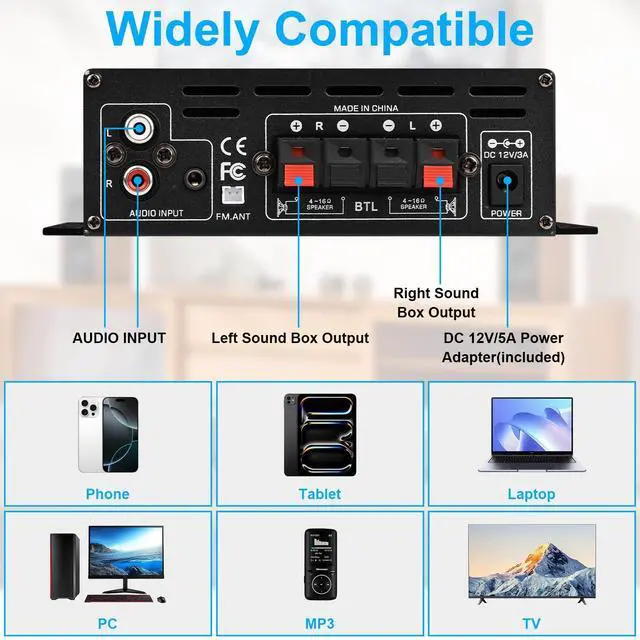 Multiple Input Modes & Mode MemoryThis amplifier features multiple input modes: Bluetooth, AUX, MIC, USB and RCA. The mode memory function remembers the last input used, ensuring that you always start in Bluetooth mode. Compatible with CD, DVD, TV, PC, tablets, phones, MP3 and projectors, it is ideal for indoor and outdoor use, parties, cars and classes.